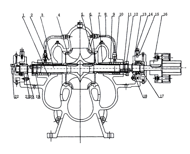 S型中開泵的吸入口和吐出口均在水泵的軸心線下方,與軸線垂直成水平方向。維修方便,無須拆卸進、出水管路及電動機,高效節能、應用範圍廣。