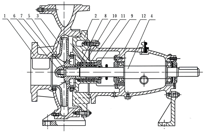 IS、IR型臥式單級單吸清水離心泵為後開式,拆開泵蓋和葉輪時不需拆卸吸水和排出管路。懸架內裝有兩個滾珠軸承,用機器油或潤滑脂潤滑。泵通過彈性聯軸器由電動機直接驅動。渦室、腳、進水法蘭和出水法蘭鑄成一個整體。