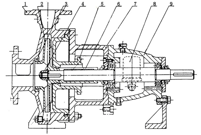 泵蓋通過止口固定在中間支架上,然後通過泵體與中間支架止口的聯接把泵蓋夾緊在中間,泵體是軸向吸入,徑向排出,腳支承式,可直接固定在底座上。懸架部件 通過止口固定固定在中間支架上,並用懸架支架支撐在底座上。為拆卸方便,設計了加長聯軸器,檢修時可以不拆卸進出口聯接管路,泵體和電動機。隻需拆下聯軸 器的中間聯接件,即可退出轉子部件進行檢修。這是國際上通用的一種結構形式。