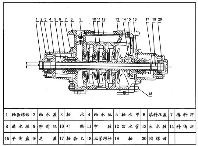 4) 將出水段〈13〉裝到中段上,然後用拉緊螺栓〈18〉將進水段、中段和出水段緊固在一起。